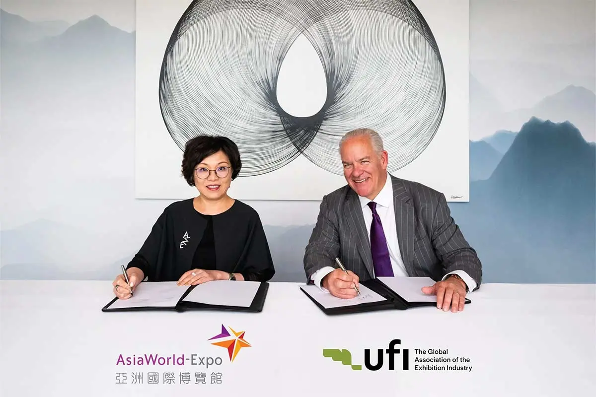 The official signing took place during the 92nd UFI Global Congress in Hong Kong SAR between Hugh Jones, UFI President 2024-25, and Irene Chan, CEO of AsiaWorld-Expo.