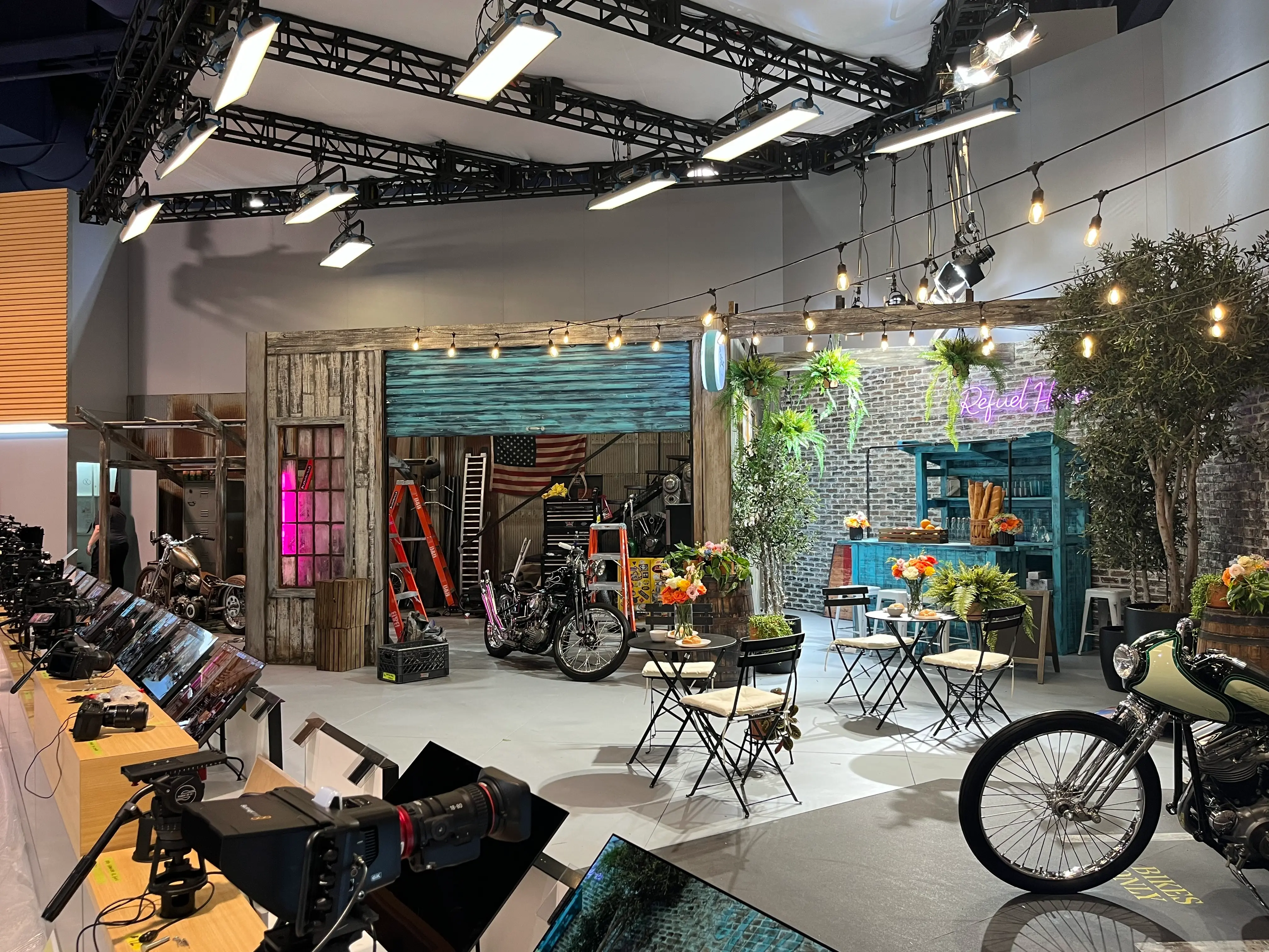 The environment uses a studio-style layout with clear zones for demos and seating. Overhead truss supports rectangular light fixtures above the central area. The floor plan combines open space with café tables, plants, and prop elements, including motorcycles and shop tools. Textured walls and practical lights separate each area while keeping sightlines open across the space.