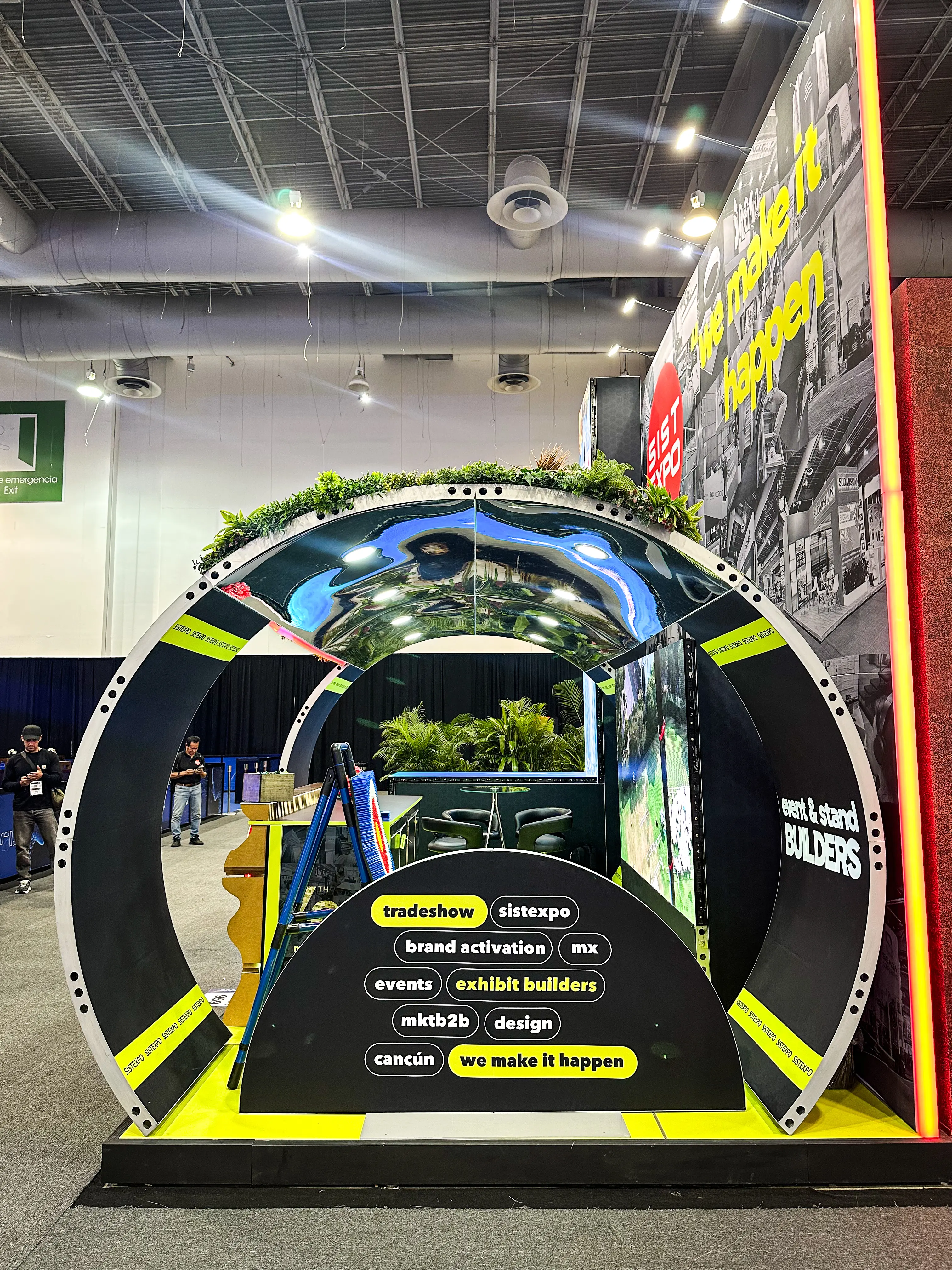 The exhibit centers on a circular, walk-through structure built around a continuous ring frame. The form creates a defined entry and exit while framing a small interior meeting area with seating and greenery. Vertical graphic panels line the exterior, while integrated lighting highlights the curved profile. The open front and rear maintain visibility into the space from the aisle.