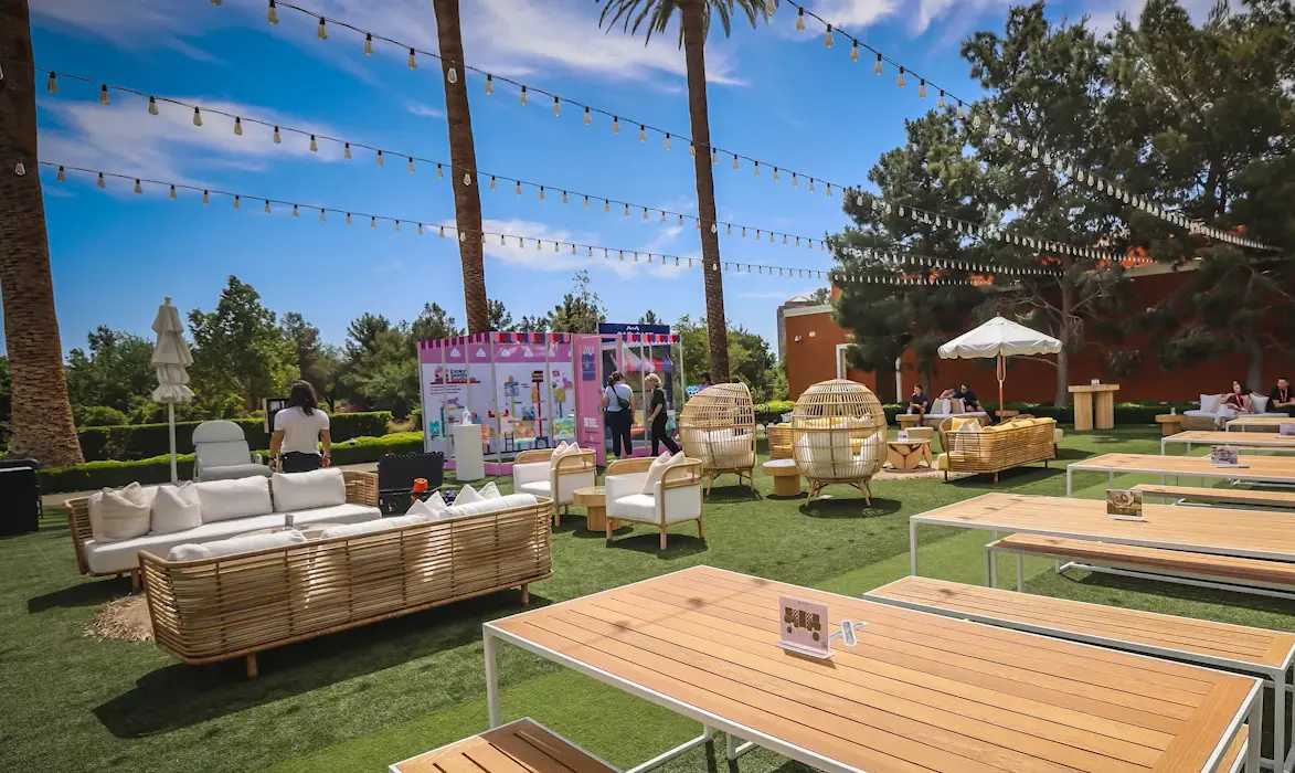 The 2025 Connect Spring Marketplace creates an open-air event space with seating areas distributed across a lawn setting. Modular tables and lounge furniture form clear gathering zones. String lighting runs overhead to define the footprint. The design integrates palm trees and existing landscaping, while wide walkways support easy movement and casual interaction throughout the space.