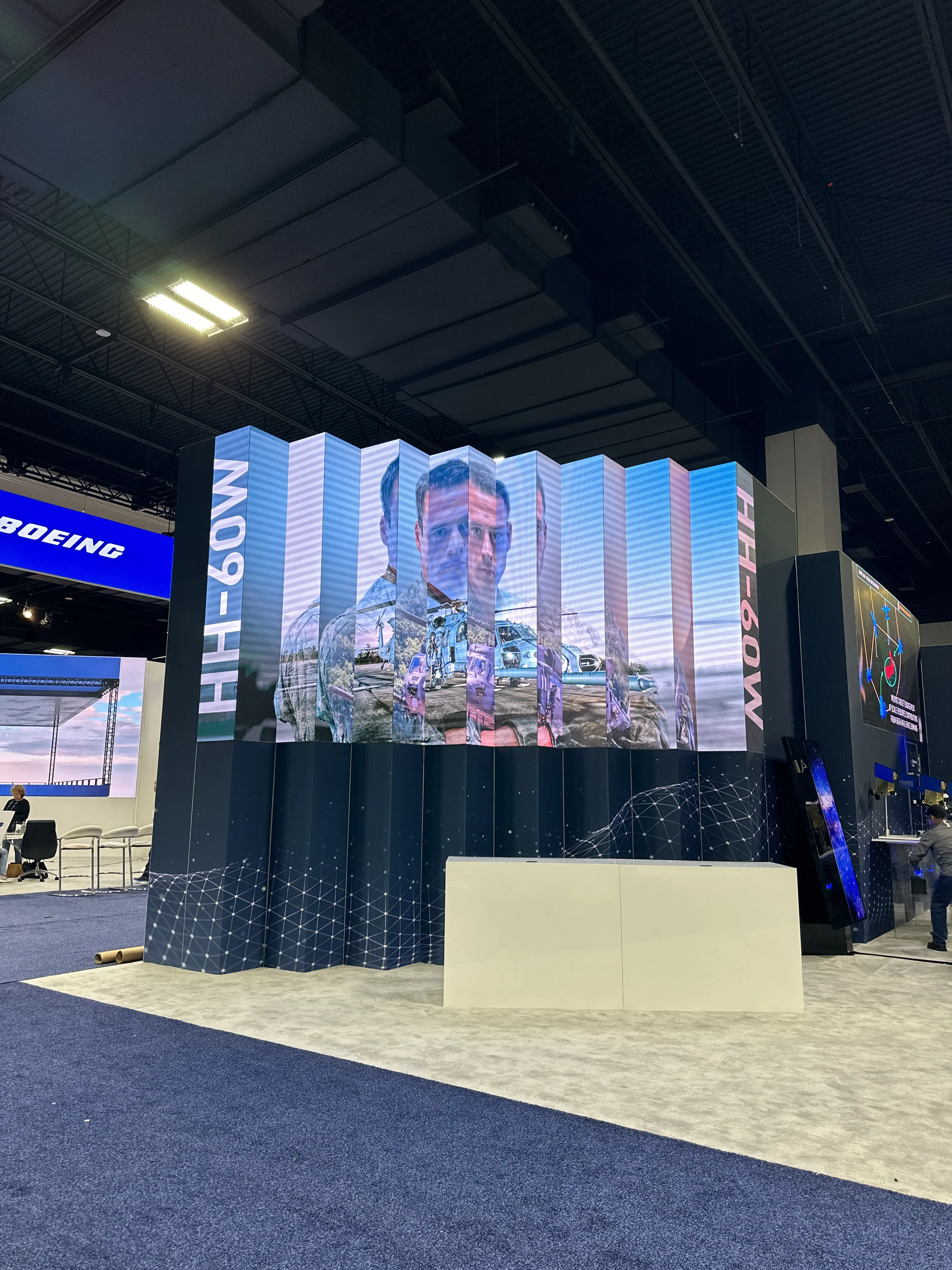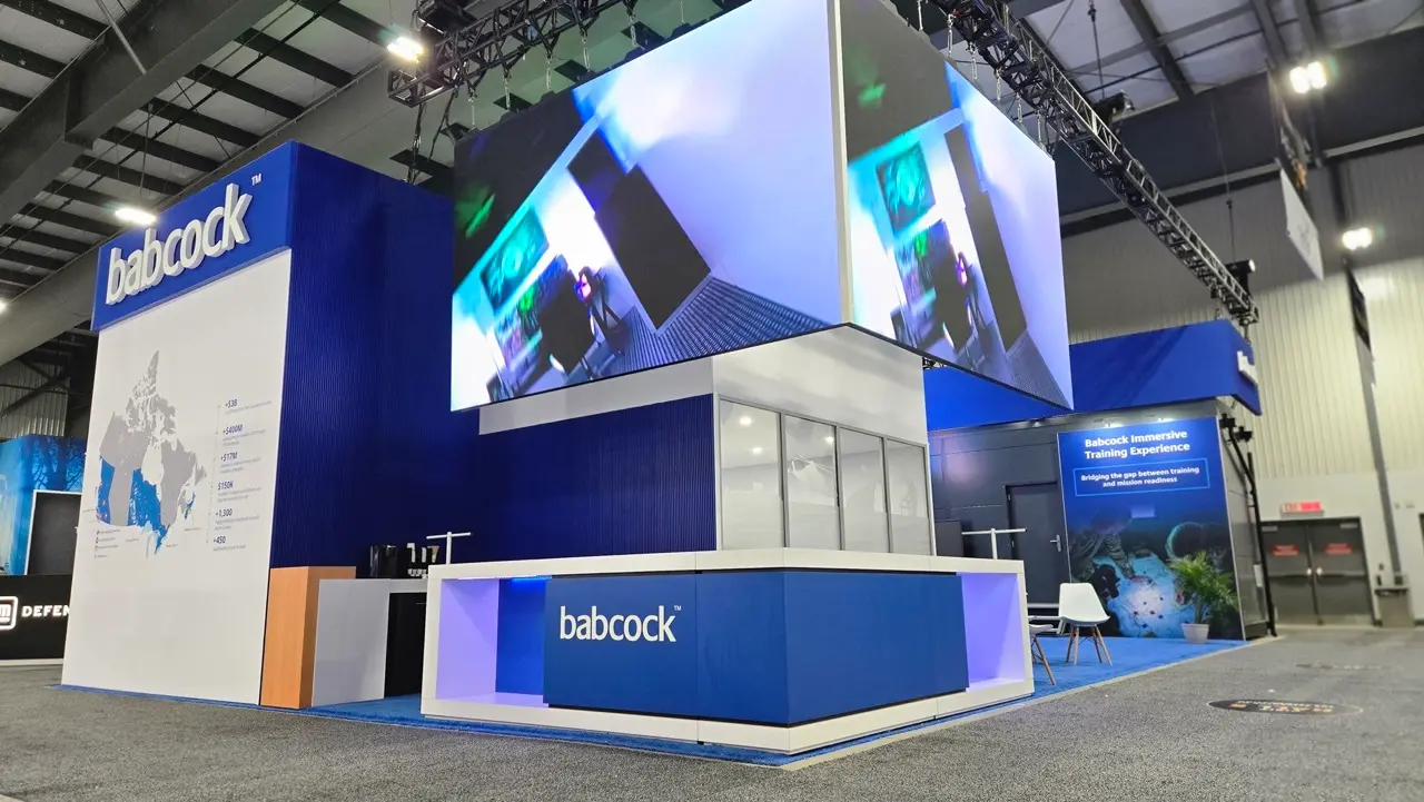 The Babcock exhibit uses a large island layout with clean lines and bold branding on all sides. A suspended LED cube anchors the structure and delivers motion content above the floor. Enclosed meeting rooms sit beneath the screens, while open counters support visitor flow. The design balances scale, visibility, and function within a clearly defined footprint.
