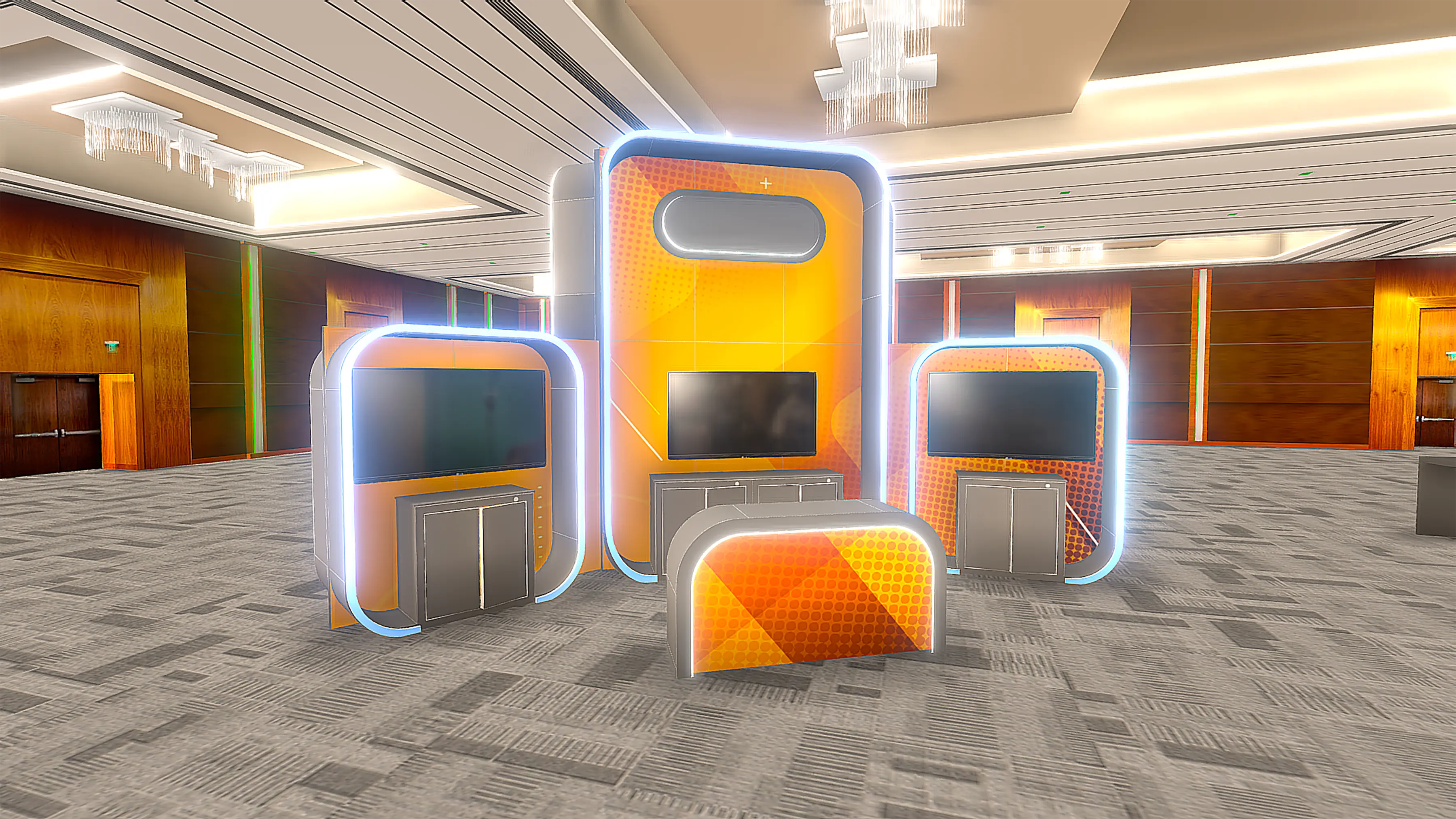 This unsold concept uses rounded, freestanding display towers arranged in a compact cluster. Each unit integrates a monitor and enclosed storage, creating clear presentation zones without permanent walls. Soft edge lighting outlines the structures and improves visibility from multiple angles. The modular layout supports quick setup and flexible placement while maintaining a consistent visual identity.