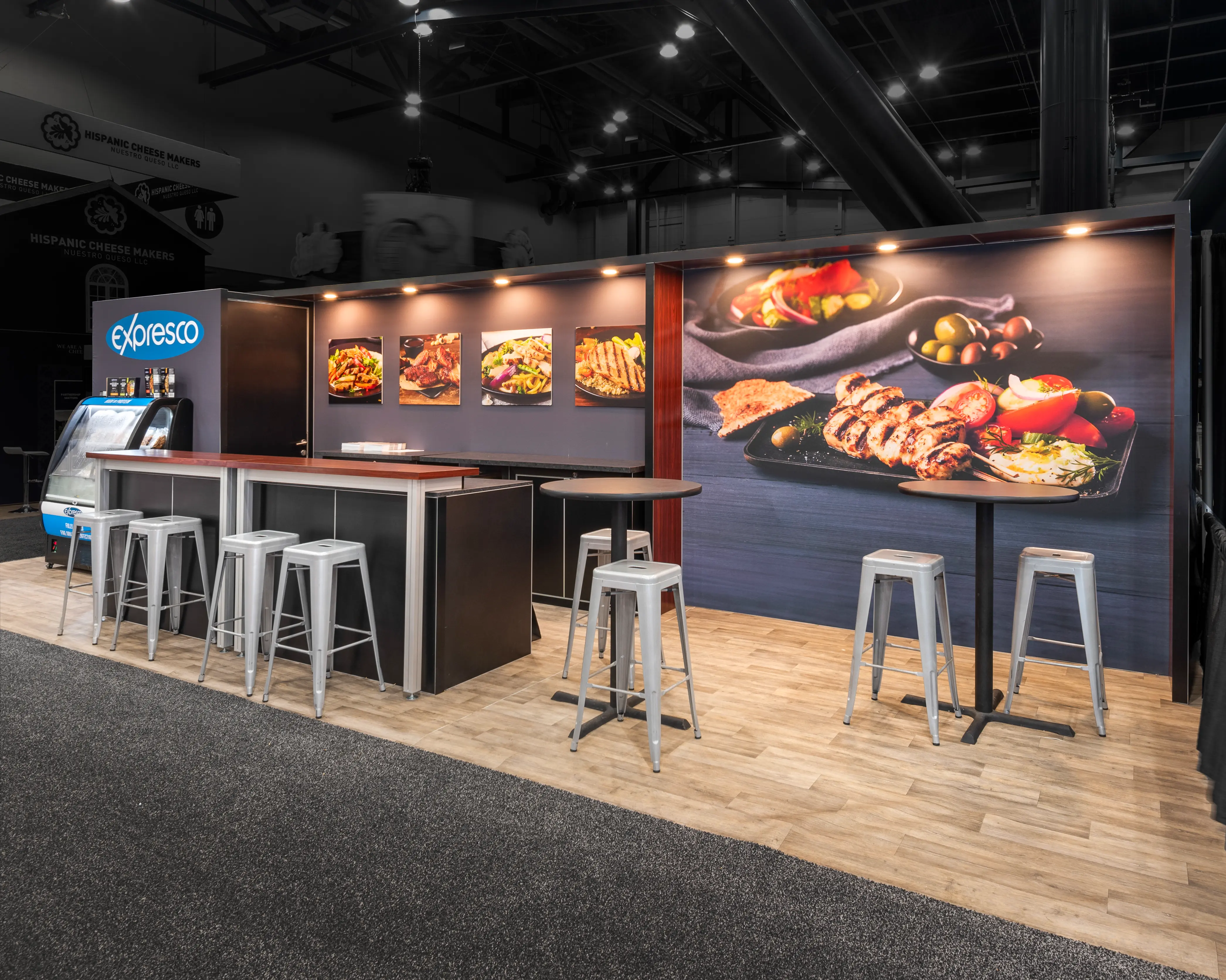 The Expresco exhibit uses a straight-line layout with a service counter and high-top tables positioned along the front edge. Large food photography panels line the back wall and define the space. Wood-look flooring separates the booth from the aisle, while overhead lighting highlights product visuals. The design supports food service, casual seating, and clear brand presentation within a compact footprint.
