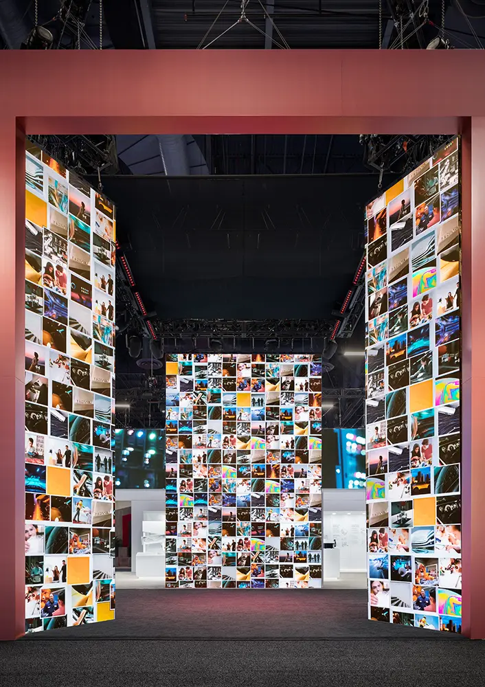 The exhibit is organized around a tall, rectangular entry frame that creates a defined threshold into the space. Large LEDskin walls line both sides, displaying a grid of image-based content that extends upward to full height. A matching LED backdrop anchors the rear of the booth. The open central aisle maintains clear circulation and direct sightlines through the structure.