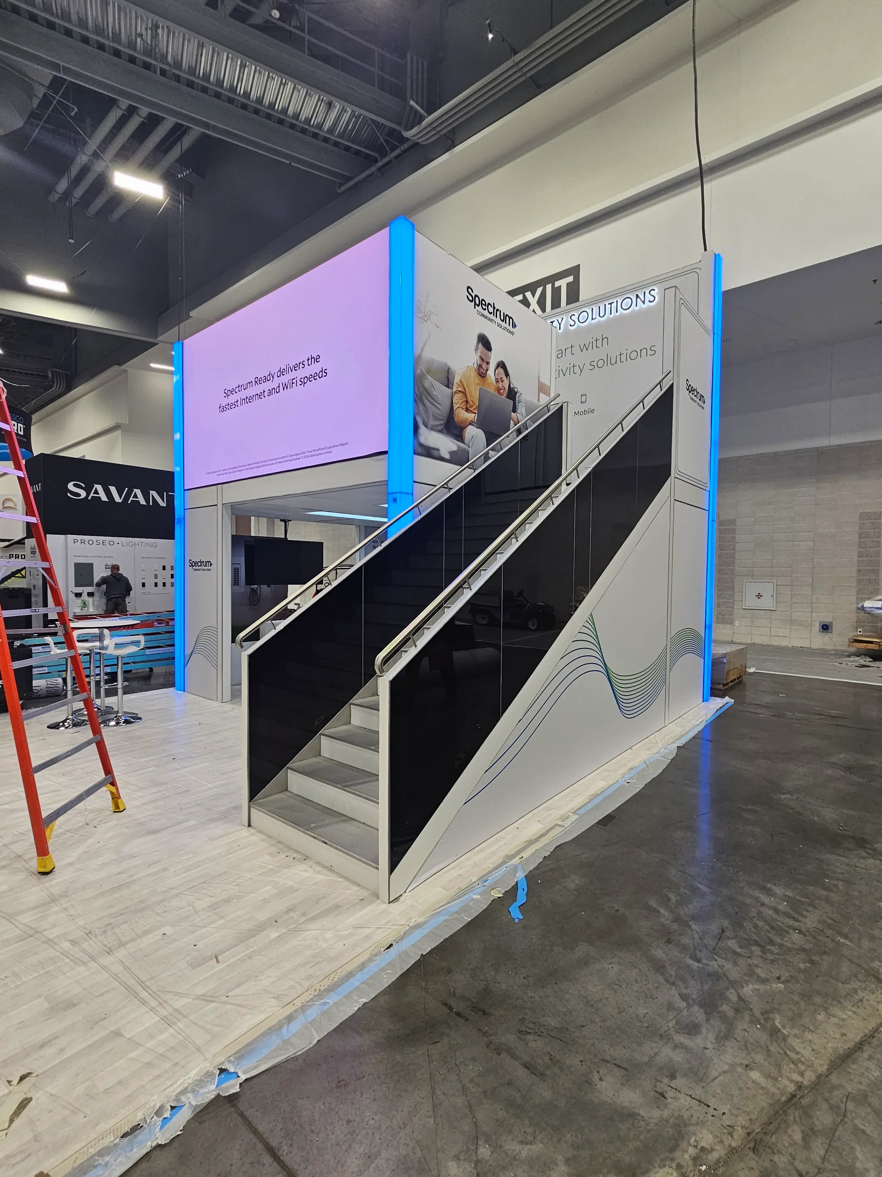 The exhibit uses a double-deck structure with a straight stairway leading to an upper-level platform. Large graphic panels wrap the exterior, while LED accents frame the corners and stair edges. A screen mounted at the upper level provides visible content from the aisle. The structure maintains open ground-level access while clearly separating upper and lower zones.