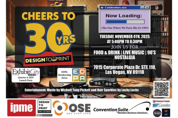 (Design to Print’s 30-year celebration, held November 4, 2025, will feature food, live music, and ’90s nostalgia alongside an Exhibit Designers and Producers Association (EDPA)
