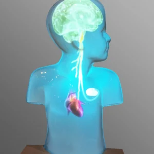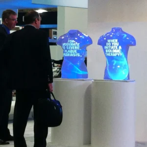Another product of this system for three-dimensional projection, the Anatomical VideoSculpture is a life-sized human projection that “opens up” to reveal various internal organs. The presentation can also display actual surgical footage along with mechanism of action animations.