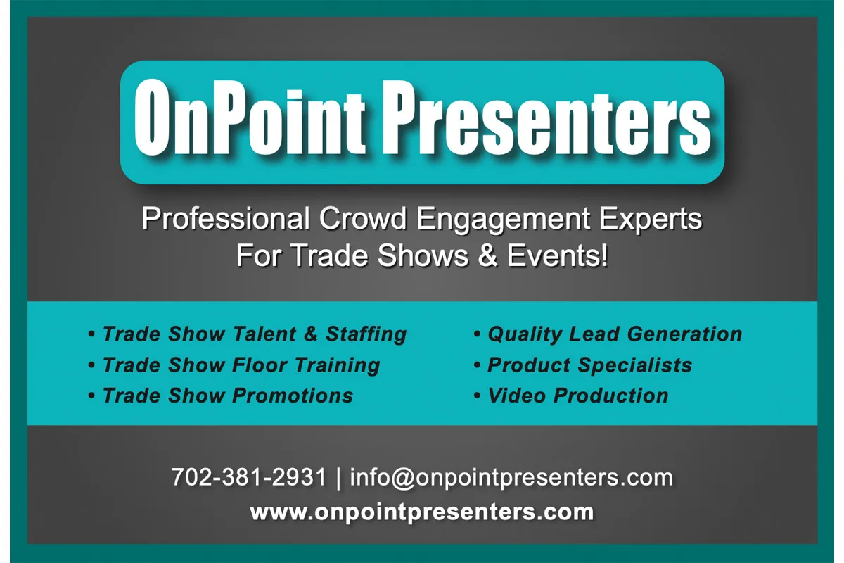 OnPoint Presenters based in Las Vegas (we serve nationally and internationally) and our specialty is trade show marketing and live event talent. Think brand ambassadors, emcees, presenters, & crowd gathers. We provide trade show seasoned professionals who know how to get butts in seats, foot traffic into a booth, communicate companies objectives, and know their way around an expo hall. OnPoint provides onsite TV hosts/crews for video production needs. Engaging with people is what we do best!